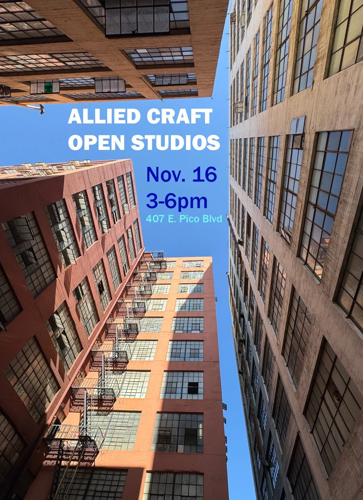 OPEN STUDIO Sunday Nov 16th November 08, 2025 Open Studios at Allied Crafts Building Sunday, November 16th, from 3pm - 6pmMultiple Artist Studios OpenAllied Crafts Building, DTLA407 E Pico Blvd, LA 90015My studio is on the 9th floor, #903. Plenty of nearby free street parking on Sundays.